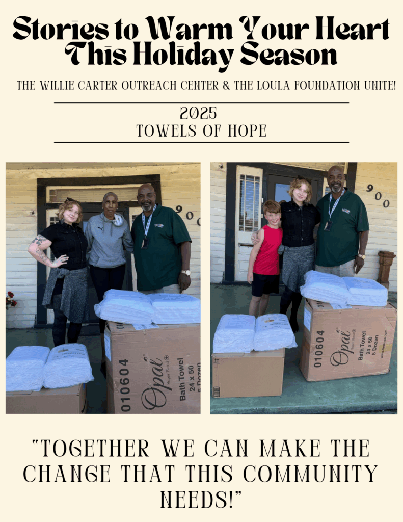 This year, for our 2nd Annual Towels of Hope Mission, we partnered with The Loula Foundation to donate towels to one of our Local Shelters